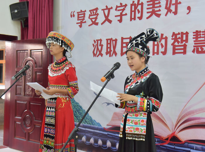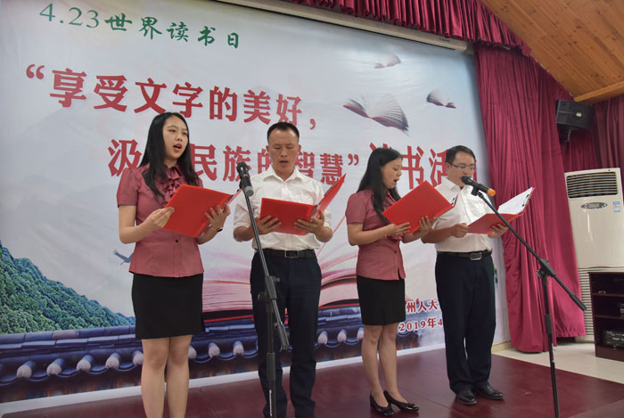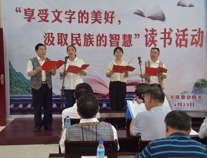 “是否有一段文字,影响你生命的成长;是否有一篇文章,直抵你心灵深处。”在舒缓的背景音乐中,办公室朗读小组上场了,他们带来的是诗朗诵《同是一颗心,同是一条根》。“在56个民族的大家庭里/各族人民手挽手/相互依存,互相促进/团结一心,共同发展/到处飞扬着欢歌/到处浇灌着民族团结之花/这花是一道美丽的风景/构成了和谐的旋律……/在抑扬顿挫的朗读声中,大家仿佛在壮乡苗岭、瑶山彝寨中行走,听山欢水唱,看莺歌燕舞、繁花似锦。