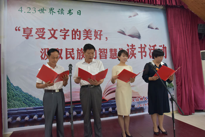 “彩云之南/在这千年古地/我们齐聚狂欢/魅力七都/在这西部明珠/我们为团结举杯……/”州人大常委会副主任张仁茂带领社建委和教工委的同志给大家带来诗朗诵《民族团结之歌》,他们身着民族盛装,向大家讲述了文山各少数民族的风情故事:“隆隆炮响/那是三月三的爆竹/声声清脆/那是竹竿舞的节奏/雄壮有力/那是铜鼓的音符/轻盈欢快/那是彝舞的热情……/”他们娓娓道来,中华民族5000年的历史:“从珠穆朗玛到扬子江尾/从乌苏里的摇船到南沙边陲/五千年的生死不离/五千年的唇齿相依/涤荡着民族的灵魂/铸就了不屈的脊梁……看/那座腾飞的雕像/放飞了五十六个民族的和谐荣光……”