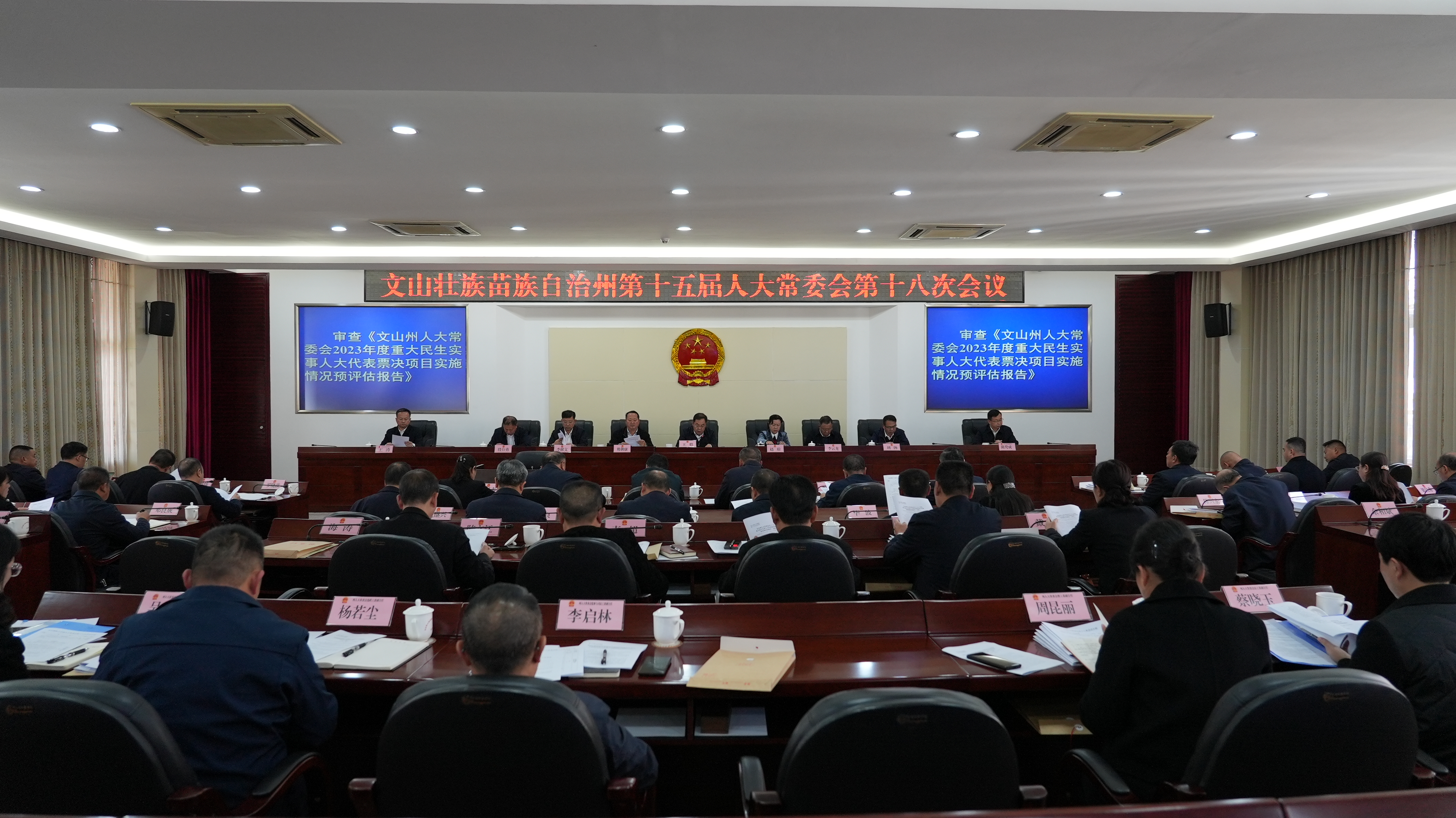 会议听取和审议了《文山州人大常委会2023年度重大民生实事人大代表票决项目实施情况预评估报告》;审议和表决通过了《文山州人大常委会关于批准文山州人民政府2024年重大民生实事候选项目的决议(草案)》《文山壮族苗族自治州第十五届人民代表大会第四次会议有关事项》、关于提请审议《云南省文山壮族苗族自治州村庄规划建设管理条例(修订草案)的决定(草案)》《文山壮族苗族自治州第十五届人民代表大会常务委员会代表资格审查委员会关于个别代表的代表资格审查情况的报告》。